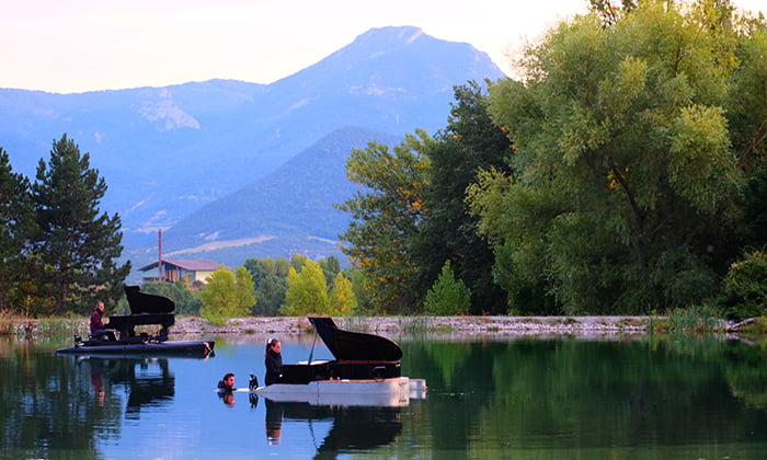 Vous êtes artistes associés de pianO du lac depuis plusieurs années… que préférez-vous dans le fait de jouer sur l’eau ? Que représente pour vous cette aventure flottante ?