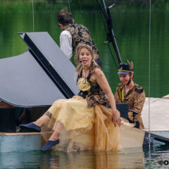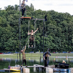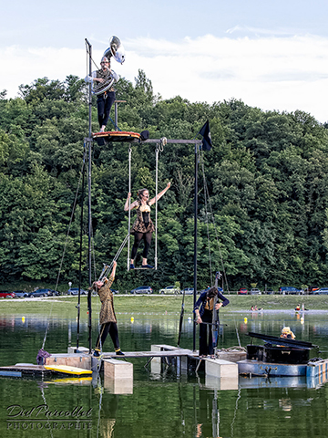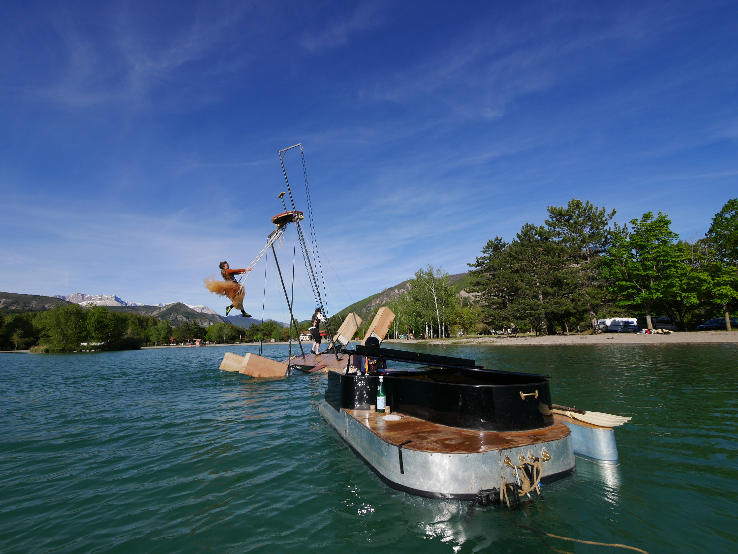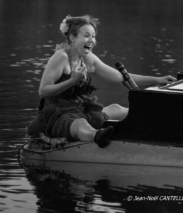 QUEL PIANO ? Le piano flottant C5 qui navigue à fleur d'eau (la pianiste joue les pieds dans l’eau !) agrémenté d’un tout nouveau portique acrobatique...