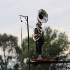 La nouvelle structure flottante allait apporter plein de nouvelles possibilités, mais aussi plein de nouvelles contraintes. Je me suis dit que nous ne serions pas trop de trois pour gérer tout ça. Oh et si on mettait un soubassophone tout en haut des mâts, oh oui des cuivres en plus du piano. Des cuivres, du clown.. Etienne Ranger évidemment ! Swanie et moi avions déjà travaillé à plusieurs reprises avec Étienne à la mise en scène, de plus celui-ci fait du mât chinois il pourra donc grimper aisément sur la structure. Le choix m'a paru évident pour la formation de ce trio de clown qui partait déjà avec une complicité existante.